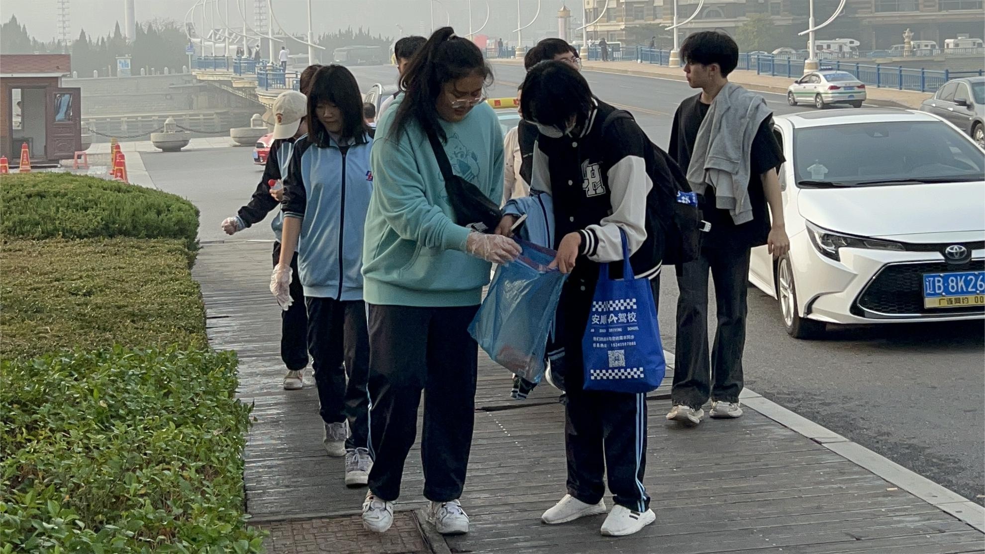 爱这座城,从点滴做起。专业训练的同时,兼顾城市环保。滨海路徒步过程中,学生们带着工具,随手捡拾地上的废纸、烟头等,再把捡拾的垃圾放入准备好的垃圾袋里,倒入垃圾桶。看着队伍走过后整洁的步道,同学们满满的成就感。