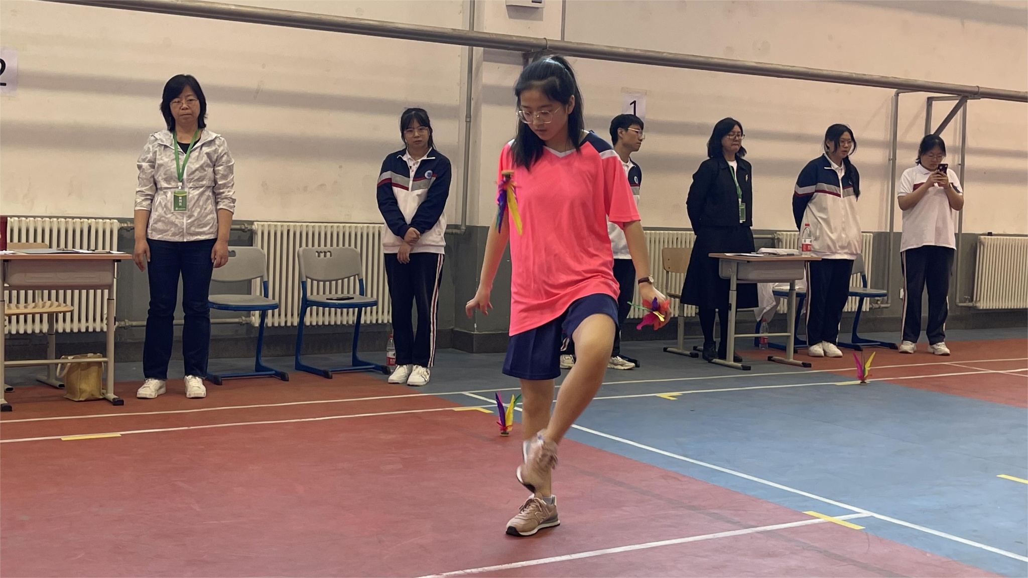 比赛在裁判员的发号声中正式开始。霎时,场馆里五彩缤纷的毽子此起彼伏,在大家的周围形成美丽的弧线,五颜六色的毽子上下翻飞,如同翩翩起舞的蝴蝶。选手们个个精神抖数、身手矫健、奋勇争先,这种顽强拼搏的精神为同学们树立了榜样!