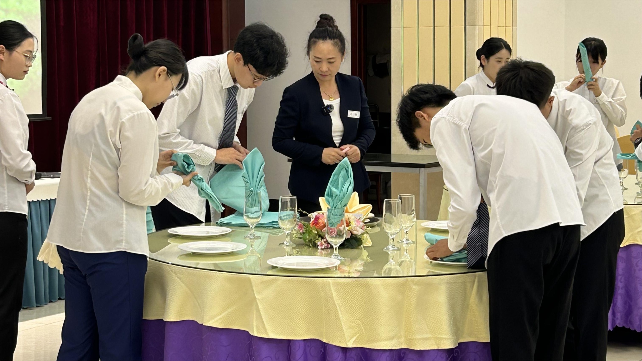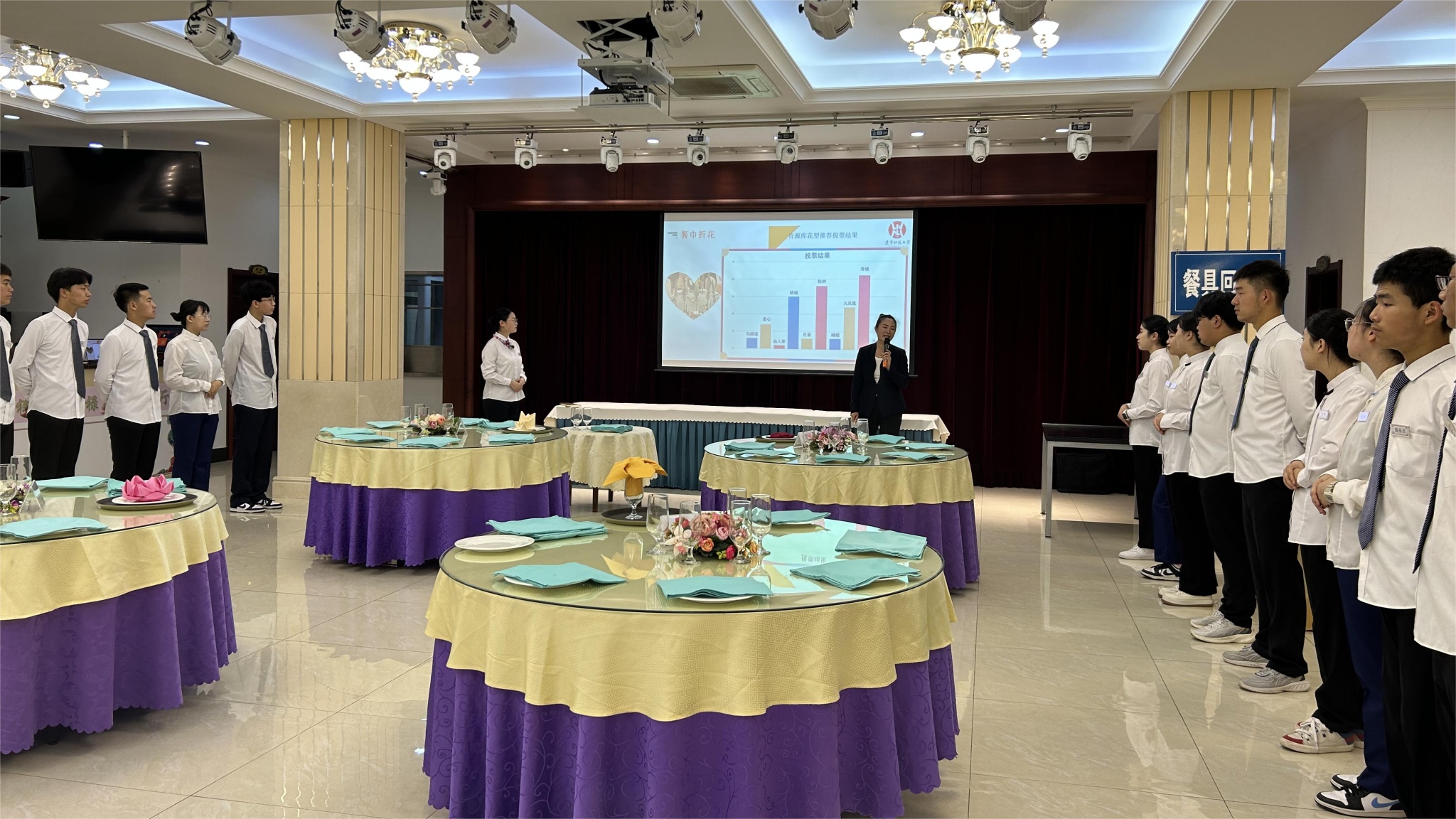 崔三羊老师组织学生分别模拟从事餐厅运营的各个岗位,按照酒店工作流程组织教学,如人员清点、仪表检查等,带领学生在餐巾折花技术要领口诀(手指舞)的复习中开启一天的学习和工作。崔老师课前布置学习任务书,安排学生预习;课中通过对预学问题进行总结和提问,引发学生思考,并进行示范和指导,帮助学生理解餐巾花的选择和应用原则。期间,针对学生集中出现的问题进行了指导和纠正,最后崔三羊老师通过课堂总结,引领学生体味精益求精的职业精神。